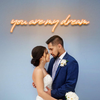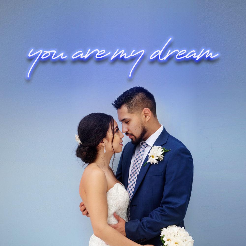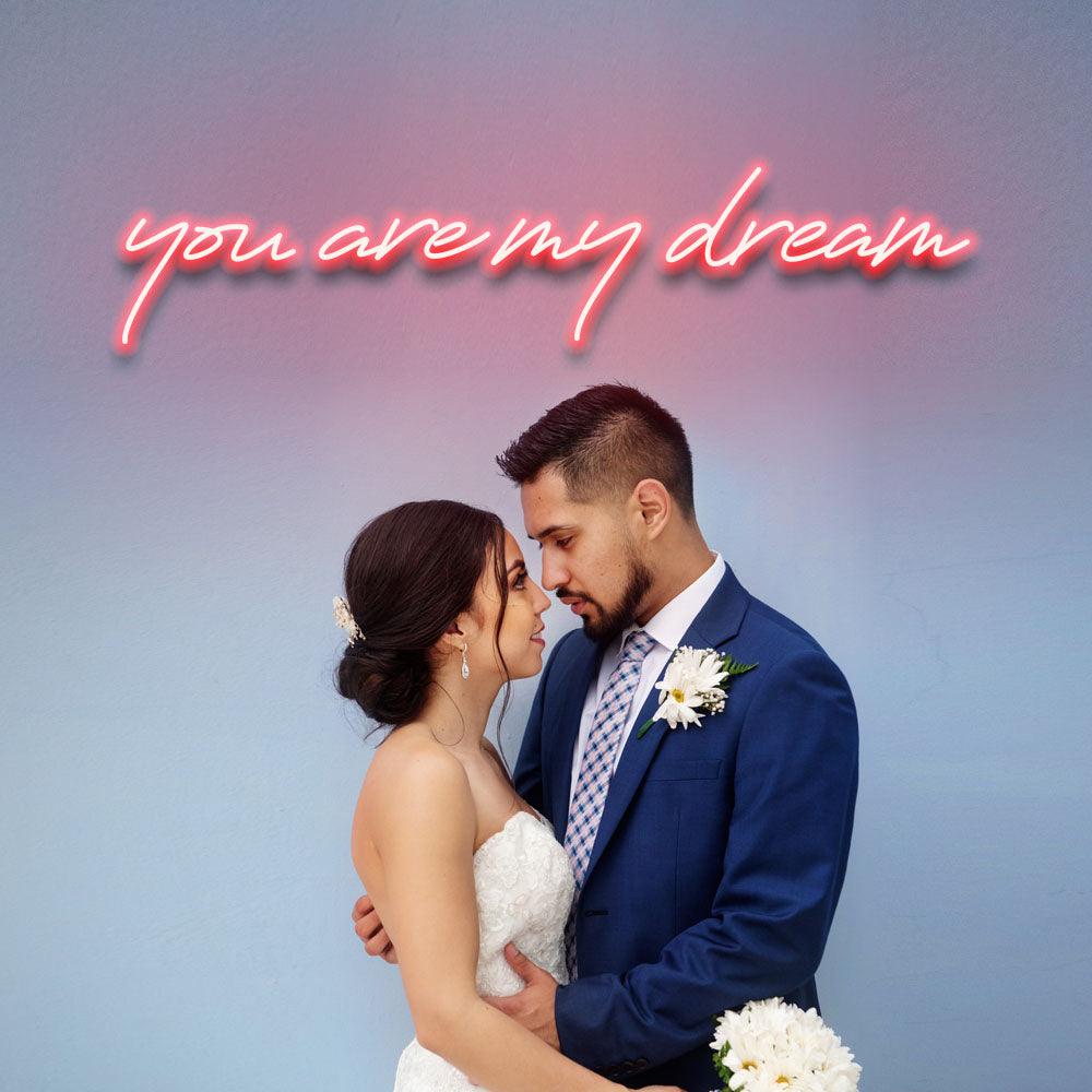 Abraza el aura romántica con nuestro letrero de neón LED "Tú eres mi sueño". Un homenaje perfecto al amor y los sueños, este signo resume las emociones profundas de su pareja. Ideal para capturar esos momentos únicos en la vida de tu colección de bodas.