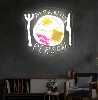 Start every day sunny-side-up with the "Morning Person" Neon Sign. This cute design sports a fun breakfast plate with a smiling fried egg, crispy bacon, gold toast, and bright white utensils. Perfect for adding that pop of fun and warmth into your kitchen, dining area, or café.